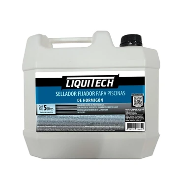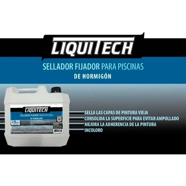 Liquitech Sellador Fijador para piscinas actúa en profundidad, ingresando en los poros de la pintura vieja, penetrando profundamente en el material y sellando así la superficie dejándola lista para ser pintada con LIQUITECH MEMBRANA PARA PISCINAS base agua. SELLA LAS CAPAS DE PINTURA VIEJA | CONSOLIDA LA SUPERFICIE PARA EVITAR AMPOLLADO | MEJORA LA ADHERENCIA DE LA PINTURA DATOS TECNICOS Tiempo total de secado: Seca al tacto en aproximadamente 60 minutos, dependiendo de la temperatura y la humedad ambiente. Esperar 2 hs antes de pintar la piscina Temperatura de aplicación: +10ºC a +30ºC Estabilidad a la intemperie: